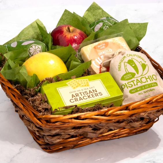 This sweet basket is the perfect quartet of gourmet fruit, cheese, nuts and crackers. An assortment of farm fresh pears and apples are paired with an artisanal farmstead gourmet cheese, California grown pistachios in a drawstring bag, and olive oil sea salt crackers. Presented in a lovely willow basket and tied with a grosgrain ribbon, this is the perfect gift for a gourmet picnic.