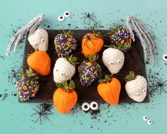 These spooktacularly tasty berries are sure to be a treat this Halloween season. Enjoy a dozen milk and white chocolatey dipped mummies, pumpkins and Halloween sprinkled berries this holiday season.